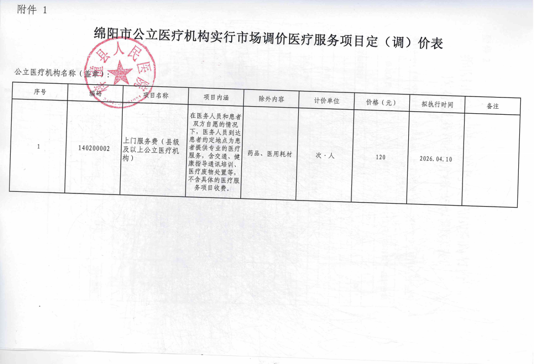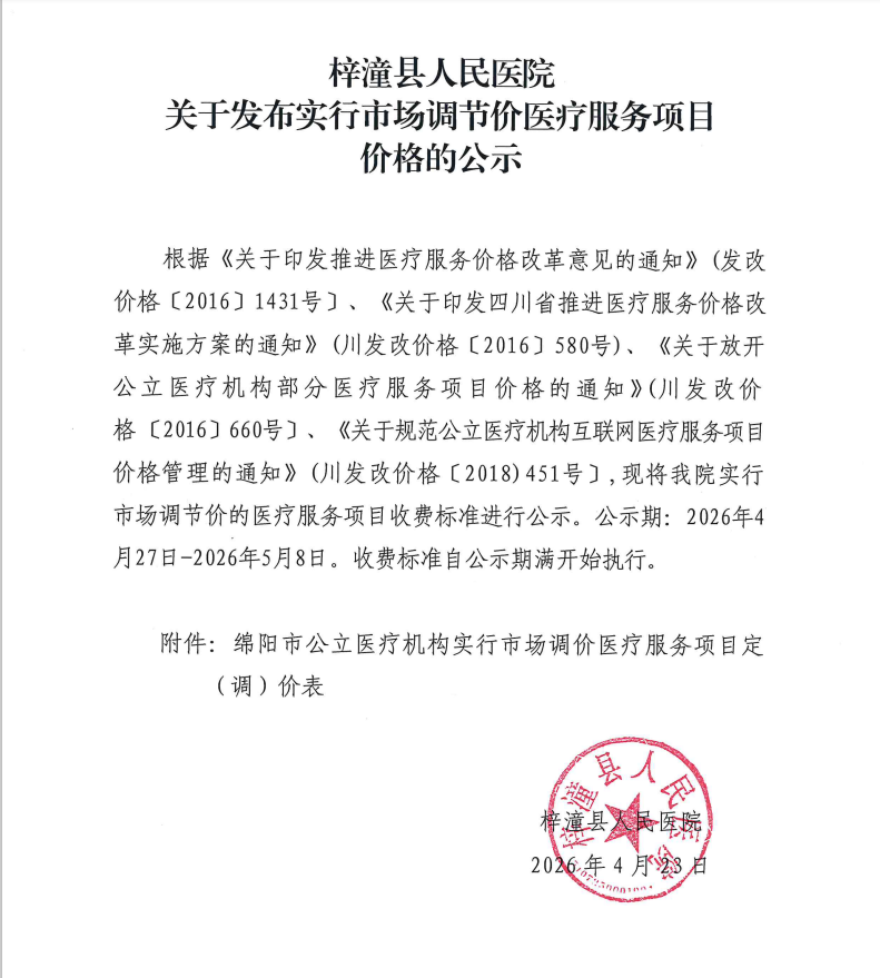 梓潼县人民医院关于发布实行市场调节价医疗服务项目价格的公示