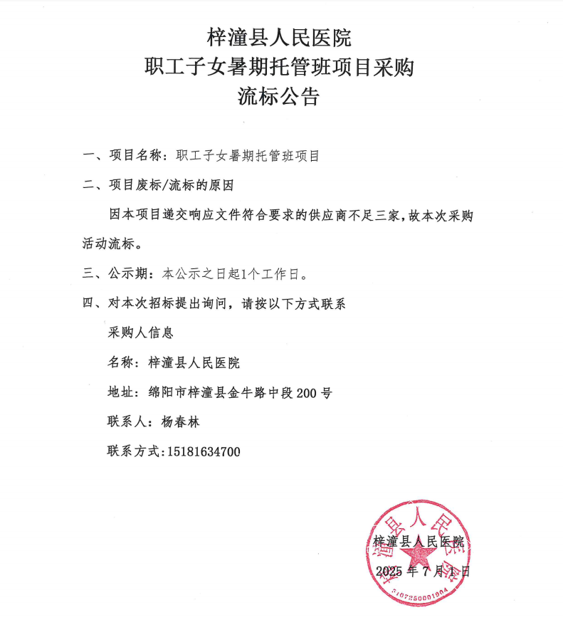 梓潼县人民医院职工子女暑期托管班项目采购流标公告