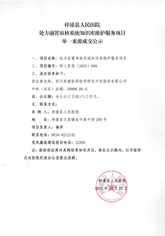 梓潼县人民医院处方前置审核系统知识库维护服务项目单一来源成交公示